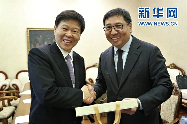 5月14日,在阿斯塔納,中國(guó)國(guó)家稅務(wù)總局局長(zhǎng)王軍(左邊)在會(huì)議開(kāi)始前與哈薩克斯坦副總理多薩耶夫舉行會(huì)晤。新華網(wǎng)發(fā) 阿比洛夫攝
