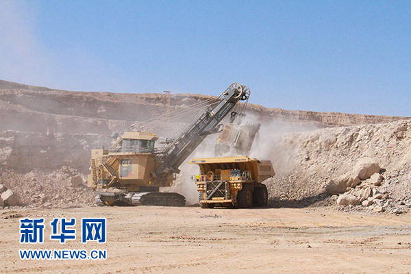 5月11日,在納米比亞西部的中廣核湖山鈾礦,載重330噸的礦用車在礦坑內(nèi)裝載礦石。新華社記者 吳長偉 攝
