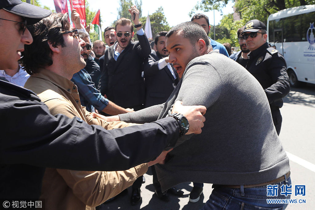 5月15日,土耳其安卡拉,示威者在以色列領(lǐng)事館附近投擲雞蛋和石塊,抗議美國駐以色列使館遷至耶路撒冷。(圖片來源:視覺中國)