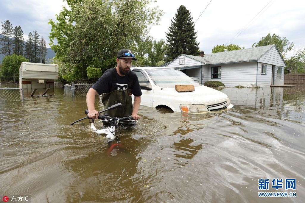 5月17日,加拿大不列顛哥倫比亞省Grand Forks,當(dāng)?shù)卦夂樗u擊,房屋、車輛浸泡水中。(圖片來源:東方IC)