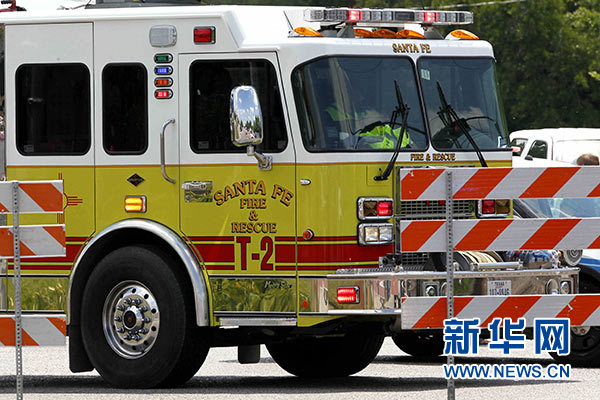 5月18日,在美國(guó)得克薩斯州加爾維斯頓郡圣菲市,一輛消防救援車在發(fā)生槍擊的圣菲高中附近待命。新華社發(fā)(宋穹 攝)
