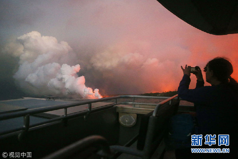 夏威夷火山熔巖流入太平洋 有毒“蒸汽云”升騰火光交映