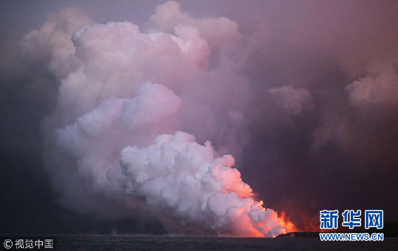 當(dāng)?shù)貢r(shí)間2018年5月22日,美國夏威夷,基拉韋厄火山大規(guī)模噴發(fā)持續(xù),火山噴發(fā)的熔巖流入太平洋,形成了有毒的“蒸汽云”。(圖片來源:視覺中國)