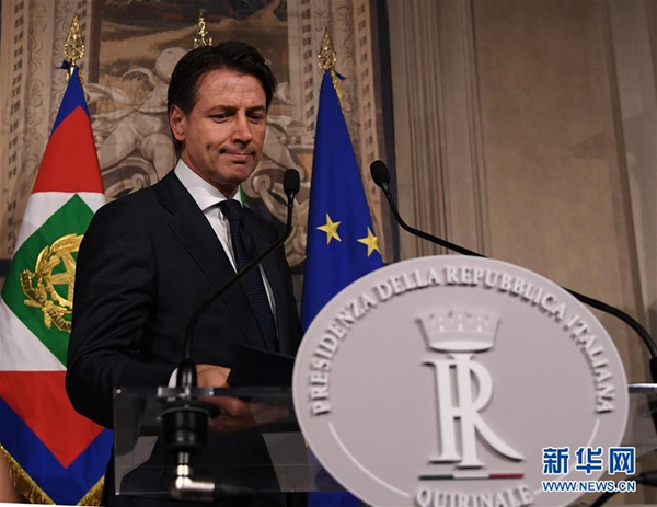 5月27日,在意大利首都羅馬,意新任總理孔特發(fā)表講話。據(jù)當?shù)孛襟w報道,孔特27日晚間與總統(tǒng)馬塔雷拉會面并提交擬定的內閣成員名單時,馬塔雷拉否決了由意大利聯(lián)盟黨和五星運動力推的持疑歐立場的經濟學家保羅·薩沃納出任財政部長。孔特向總統(tǒng)提出放棄組閣任務請求,請求得到總統(tǒng)確認。新華社發(fā)(阿爾貝托·林格里亞攝)