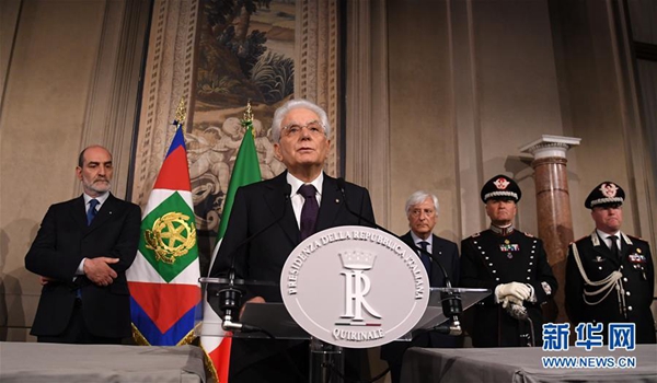 5月27日,在意大利首都羅馬,意總統(tǒng)馬塔雷拉發(fā)表講話。據(jù)當(dāng)?shù)孛襟w報道,意大利新任總理孔特27日晚間與總統(tǒng)馬塔雷拉會面并提交擬定的內(nèi)閣成員名單時,馬塔雷拉否決了由意大利聯(lián)盟黨和五星運動力推的持疑歐立場的經(jīng)濟學(xué)家保羅·薩沃納出任財政部長。孔特向總統(tǒng)提出放棄組閣任務(wù)請求,請求得到總統(tǒng)確認(rèn)。新華社發(fā)(阿爾貝托·林格里亞攝)