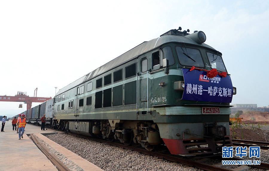 在江西省贛州市南康區(qū)贛州港,“贛州港至哈薩克斯坦”中歐班列等待發(fā)車(chē)(2017年7月27日攝)。新華社記者 彭昭之 攝