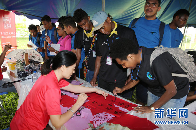 斐濟(jì)青年正在中國(guó)文化中心老師的指導(dǎo)下用毛筆寫自己的姓名。 新華網(wǎng)記者張永興 攝
