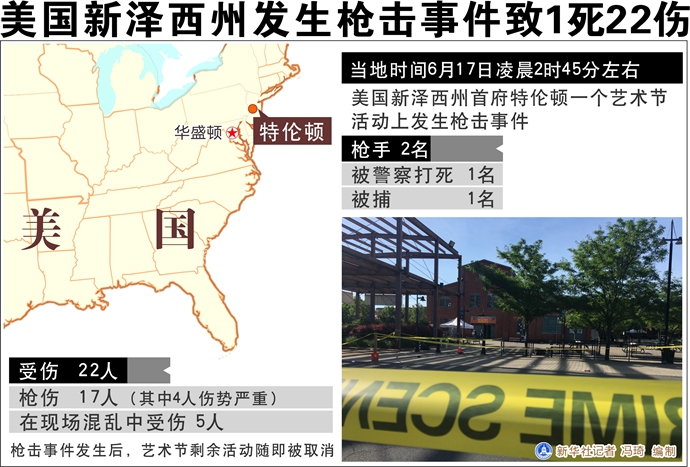 新華社華盛頓6月17日電(記者劉陽(yáng) 孫?。┟绹?guó)新澤西州首府特倫頓17日凌晨發(fā)生槍擊事件,一名槍手被打死,另有22人受傷。