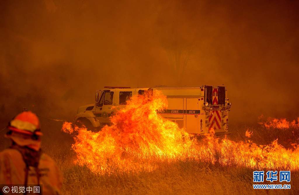 當?shù)貢r間2018年7月1日,美國加州克利爾萊克奧克斯,加州萊克縣“波尼”(Pawnee)大火持續(xù)蔓延,現(xiàn)場烈火熊熊,過火面積達3000英畝(約合12150公頃)。(圖片來源:視覺中國)