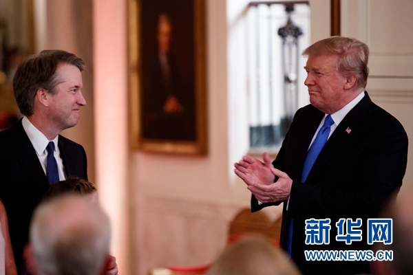 7月9日,在美國華盛頓白宮,美國總統(tǒng)特朗普(右)提名布雷特·卡瓦諾為最高法院大法官。美國總統(tǒng)特朗普9日宣布,提名布雷特·卡瓦諾出任美國聯(lián)邦最高法院大法官。特朗普當(dāng)日晚間在白宮講話時宣布了這一決定,卡瓦諾同家人一起出席了提名典禮。新華社發(fā)(沈霆攝)
