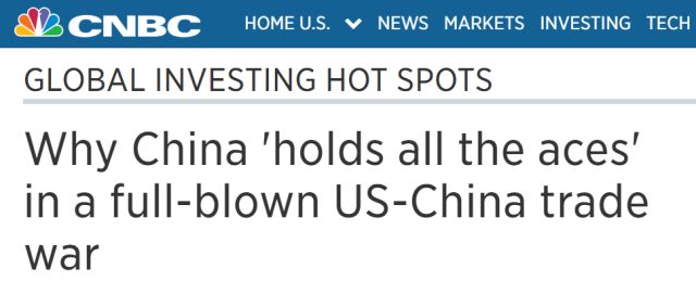 因此,CNBC這篇文章的作者也得出了與“布魯金斯學會”一樣的結論,即特朗普現在對中國的打擊只會傷及自身和盟友。這位作者甚至也列舉了CBS新聞網今天提到的那個iPhone手機的例子,并認為一旦中美貿易戰(zhàn)“全面爆發(fā)”,中國手上可打的“王牌”要比美國多。