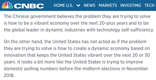 特朗普真正在意的問題,并不是創(chuàng)造一個活躍創(chuàng)新的經濟,好讓美國在未來20-30年繼續(xù)保持領先,他在乎的只是11月中期選舉的投票數字;另一方面,中國政府在意的問題,反倒是如何令其經濟在接下來的20年里保持活力,從而令中國成為一個引領世界、科技上自主獨立的國家。