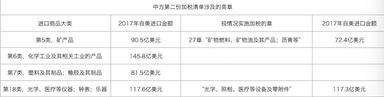 第二份清單,是從美進口的化工品、醫(yī)療設備、能源產(chǎn)品(包括煤炭、原油、成品油、液化石油氣等)等商品,2017年,中國自美國進口金額約160億美元。第二份清單是否執(zhí)行、生效時間將視美方行動另行宣布。