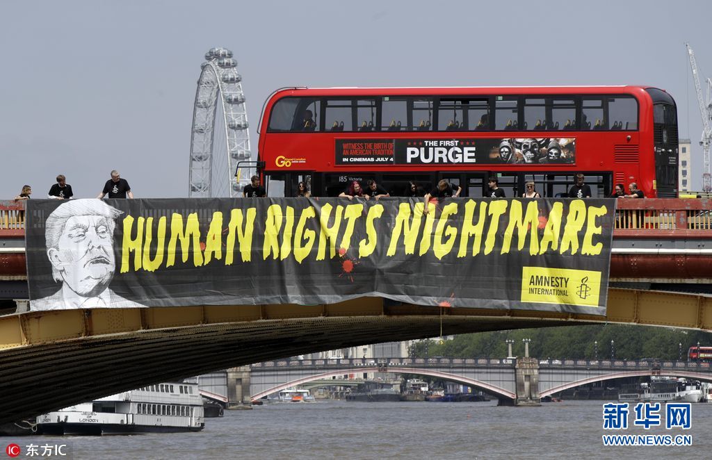 7月12日,英國(guó)倫敦,國(guó)際特赦組織成員在倫敦泰晤士河上沃克斯豪爾橋懸掛橫幅,抗議美國(guó)總統(tǒng)特朗普到訪英國(guó)。(圖片來(lái)源:東方IC)