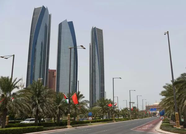 7月18日,阿聯(lián)酋首都阿布扎比的街道兩邊懸掛著中阿兩國國旗。(鄔惠我攝)