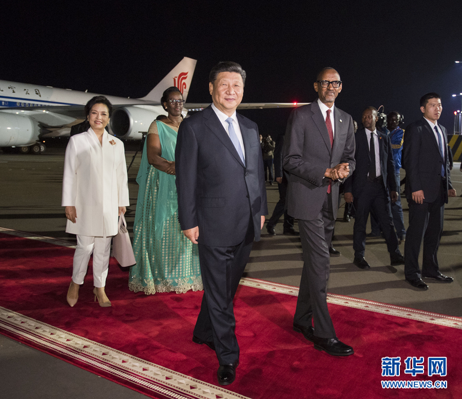 當(dāng)?shù)貢r(shí)間晚8時(shí)50分許,習(xí)近平乘坐的專機(jī)抵達(dá)基加利國(guó)際機(jī)場(chǎng)。習(xí)近平和夫人彭麗媛步出艙門,受到盧旺達(dá)總統(tǒng)卡加梅和夫人珍妮特等熱情迎接。盛裝的禮兵精神抖擻,向尊貴的客人行注目禮。盧旺達(dá)少年向習(xí)近平和彭麗媛獻(xiàn)花??用废蛄?xí)近平和彭麗媛介紹盧方其他迎接人員。身著靚麗民族服裝的當(dāng)?shù)孛癖娞饸g快的迎賓舞,敲響喜慶的非洲鼓,熱烈歡迎中國(guó)貴賓到來。