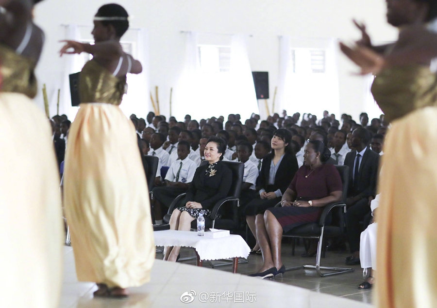 23日上午,國(guó)家主席習(xí)近平夫人彭麗媛參觀了盧旺達(dá)法維女子中學(xué)。全校師生聚集在學(xué)校大禮堂,歡迎中國(guó)貴賓到來(lái)。當(dāng)彭麗媛走進(jìn)會(huì)場(chǎng)時(shí),掌聲雷動(dòng)。同學(xué)們?yōu)榕睇愭鲁噬狭艘粓?chǎng)精彩演出:學(xué)校校歌合唱高亢激昂、中國(guó)經(jīng)典名曲《茉莉花》悠揚(yáng)嘹亮、盧旺達(dá)民族舞蹈熱情奔放。彭麗媛不斷為學(xué)生的出色表演鼓掌。演出結(jié)束后,彭麗媛向?qū)W校贈(zèng)送了一批教學(xué)用品,祝愿學(xué)校越來(lái)越好。一位同學(xué)向彭麗媛贈(zèng)送了一幅自己專門創(chuàng)作的畫(huà)像。彭麗媛高興地接過(guò)畫(huà)像大加稱贊,親吻這位同學(xué)的臉頰,并同她親切擁抱。彭麗媛對(duì)全校師生的熱情接待表示感謝。