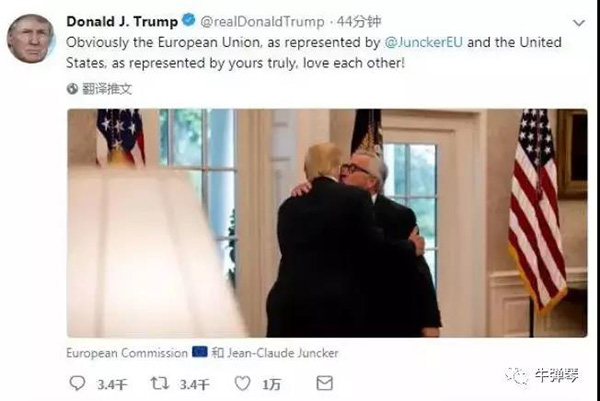 他夸耀和歐盟委員會(huì)主席容克的會(huì)晤“很溫馨”。他還在推特上貼了一張與容克“貼面禮”的照片,并這樣說:“顯而易見,容克所代表的歐盟及你們代表的美國,真的愛對方!”