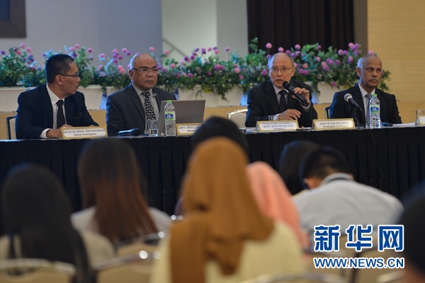 7月30日,馬航370航班客機安全調(diào)查組負責人郭師傳(右二)在馬來西亞普特拉賈亞舉行的新聞發(fā)布會上講話。 新華社發(fā)(張紋綜攝)
