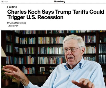 而在上周末剛剛結(jié)束的這么一場為期三天、并有數(shù)百人參加的活動上,科赫兄弟中年長的哥哥查爾斯·科赫就公開宣布他對美國政府的貿(mào)易戰(zhàn)行為很擔(dān)憂,認(rèn)為美國對中國等多個國家揮舞的關(guān)稅大棒將令美國經(jīng)濟面臨“災(zāi)難性”的衰退風(fēng)險。