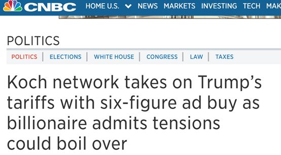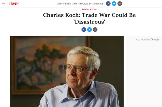 可隨著之后特朗普對中國等國發(fā)動貿(mào)易戰(zhàn)的行為,以及相關(guān)惡果的逐漸顯現(xiàn),科赫家族的最新表態(tài)也與今年1月的言論形成了鮮明的對比。