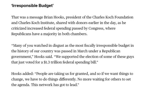 另外,科赫兄弟還表示他們不會再像以前那樣輕易支持共和黨的議員了,因為這些議員并沒有履行他們競選時的承諾,反而是一直在支持美國政府的一些違背市場的政策,比如在今年3月的一項加大政府財政開支的法案。