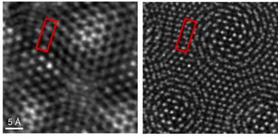 這是領(lǐng)先于過去成像方法的一個(gè)重要步驟,以前看不清是因?yàn)樘綔y器只收集了一部分散射的電子。此前,在同樣的低電壓情況下,得到的空間分辨率一般小于0.1納米。兩張圖相比,一個(gè)線條模糊,一個(gè)能看得顆粒分明。