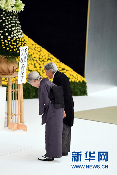 8月15日,在日本東京,日本明仁天皇(右)和皇后美智子出席“全國戰(zhàn)歿者追悼儀式”。 新華社記者馬平攝