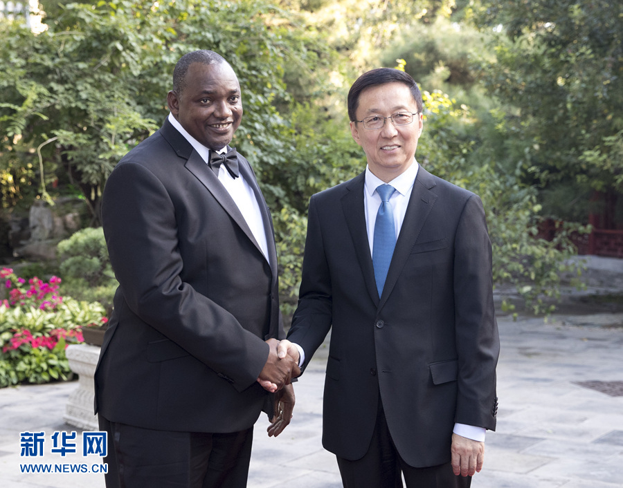 9月6日,中共中央政治局常委、國(guó)務(wù)院副總理韓正在北京釣魚(yú)臺(tái)國(guó)賓館會(huì)見(jiàn)岡比亞總統(tǒng)巴羅。 新華社記者 王曄 攝