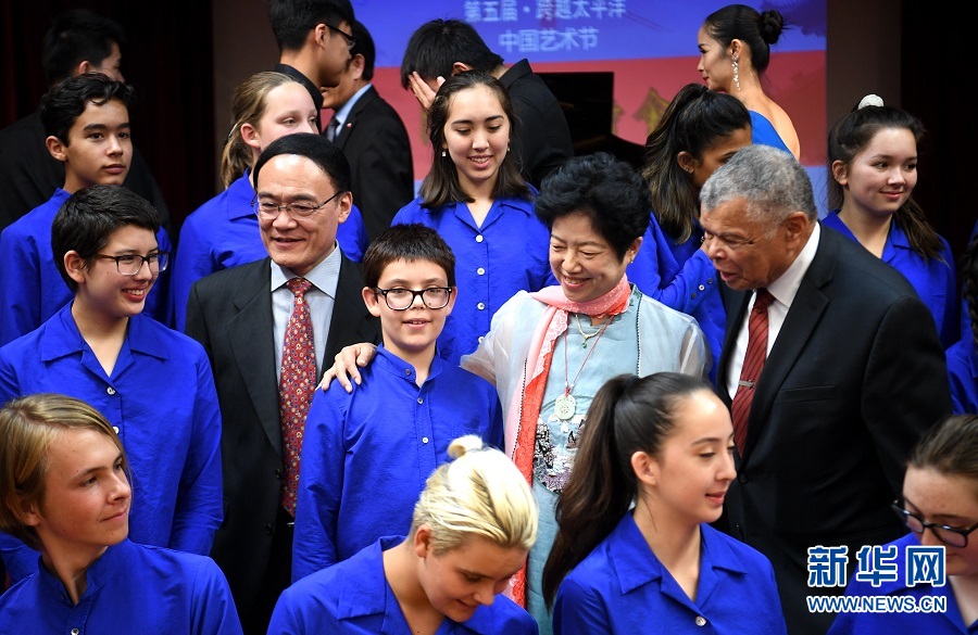 9月7日,在美國(guó)舊金山舉行的第五屆“跨越太平洋——中國(guó)藝術(shù)節(jié)”開幕式上,皮德蒙特東灣兒童合唱團(tuán)成員與來(lái)賓合影。第五屆“跨越太平洋——中國(guó)藝術(shù)節(jié)”開幕式7日在中國(guó)駐舊金山總領(lǐng)事館舉行。美國(guó)民間友好團(tuán)體、藝術(shù)界人士等230多人出席。 新華社記者吳曉凌攝
