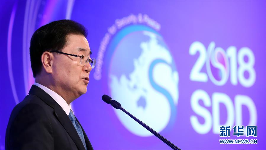 9月13日,在韓國首爾,韓國總統(tǒng)府青瓦臺國家安保室室長鄭義溶在“2018年首爾安保對話”開幕式上致辭。韓國總統(tǒng)府青瓦臺國家安保室室長鄭義溶13日表示,為從根本上消除可能導(dǎo)致韓朝雙方軍事沖突的危險(xiǎn)因素,提升軍事互信水平,韓朝正就在軍事領(lǐng)域開展廣泛合作進(jìn)行協(xié)商并制定方案。 新華社/紐西斯通訊社