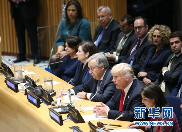 9月24日,在紐約聯(lián)合國總部,聯(lián)合國秘書長古特雷斯(前排右三)出席“呼吁全球采取行動應對世界毒品問題”高級別會議。新華社記者秦朗攝