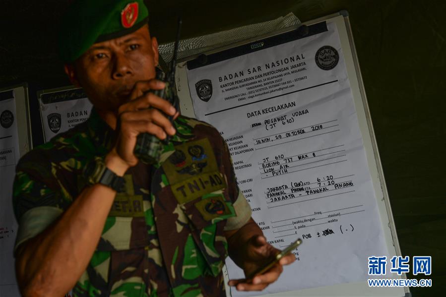 10月29日,在印度尼西亞雅加達(dá),一名軍人站在客機搜救信息的展板前。新華社發(fā)(維里 攝)