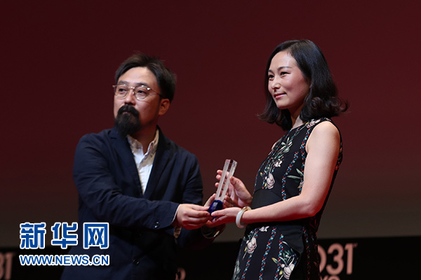 11月2日,在第31屆東京國(guó)際電影節(jié)頒獎(jiǎng)典禮上,中國(guó)導(dǎo)演王麗娜(右)在作品《第一次的離別》獲“亞洲未來(lái)”單元最佳影片獎(jiǎng)后上臺(tái)領(lǐng)獎(jiǎng)。 新華社記者 杜瀟逸 攝