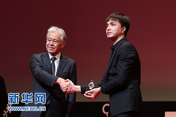 11月2日,在第31屆東京國(guó)際電影節(jié)頒獎(jiǎng)典禮上,中國(guó)導(dǎo)演黃璜(右)在作品《武林孤兒》獲“亞洲未來(lái)”單元國(guó)際交流基金亞洲中心特別獎(jiǎng)后上臺(tái)領(lǐng)獎(jiǎng)。新華社記者 杜瀟逸 攝
