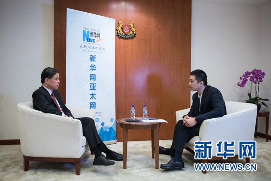 近日,新加坡貿(mào)工部長陳振聲在新加坡接受新華網(wǎng)專訪。圖為陳振聲(左)與本次訪談主持人、新華網(wǎng)新加坡負(fù)責(zé)人吳磊對話。新華網(wǎng) 王應(yīng)耀 攝