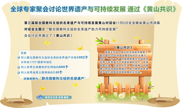 全球?qū)<揖蹠?huì)討論世界遺產(chǎn)與可持續(xù)發(fā)展 通過《黃山共識》 新華社記者 肖瀟 編制
