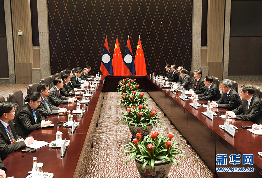 11月4日,國家主席習(xí)近平在上海會見老撾總理通倫。 新華社記者 丁海濤 攝