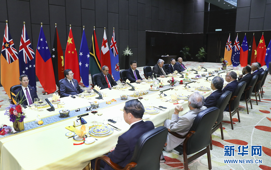 11月16日,國家主席習(xí)近平在莫爾茲比港同巴布亞新幾內(nèi)亞總理奧尼爾、密克羅尼西亞聯(lián)邦總統(tǒng)克里斯琴、薩摩亞總理圖伊拉埃帕、瓦努阿圖總理薩爾瓦伊、庫克群島總理普納、湯加首相波希瓦、紐埃總理塔拉吉等建交太平洋島國領(lǐng)導(dǎo)人以及斐濟(jì)政府代表、國防部長昆布安博拉舉行集體會晤。習(xí)近平主持會晤并發(fā)表主旨講話。 新華社記者 謝環(huán)馳 攝