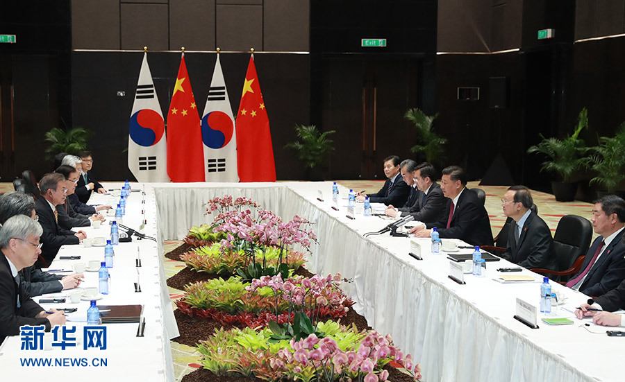 習(xí)近平指出,過去一年,我同總統(tǒng)先生達(dá)成的各項(xiàng)共識正得到有效落實(shí),兩國關(guān)系穩(wěn)步改善和發(fā)展。我們要不斷深化中韓戰(zhàn)略合作伙伴關(guān)系,共同為促進(jìn)地區(qū)持久和平和繁榮作出積極貢獻(xiàn)。雙方要繼續(xù)發(fā)揮好高層引領(lǐng)作用,尊重彼此核心利益和重大關(guān)切,加強(qiáng)溝通,建立和鞏固互信,繼續(xù)妥善處理好敏感問題。要重點(diǎn)推進(jìn)共建“一帶一路”,加快兩國自由貿(mào)易協(xié)定第二階段談判,推動雙邊互利合作優(yōu)化升級。要加強(qiáng)在亞太經(jīng)合組織、二十國集團(tuán)、中日韓等多邊框架內(nèi)協(xié)調(diào)和合作。