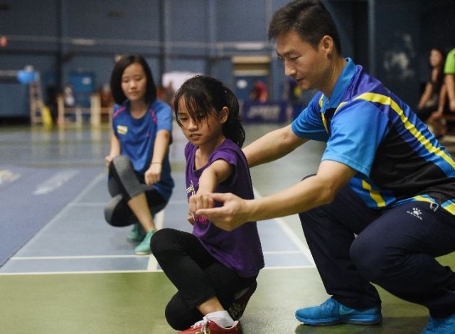 文萊國家武術(shù)隊教練李輝(右)在指導文萊學生武術(shù)動作。新華社記者王申攝