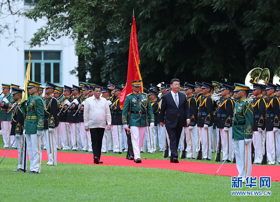 菲律賓總統(tǒng)府充滿莊嚴(yán)、隆重、熱烈的氣氛。當(dāng)?shù)貢r間下午4時40分許,習(xí)近平乘車抵達(dá)總統(tǒng)府,受到杜特爾特?zé)崆橛印蓢椎巧蠙z閱臺。儀仗隊(duì)行持槍禮。鼓手敲起激昂的鼓點(diǎn),號手吹響迎賓的號聲。軍樂隊(duì)奏中菲兩國國歌?,F(xiàn)場鳴放21響禮炮。習(xí)近平在杜特爾特陪同下沿紅地毯檢閱儀仗隊(duì)。檢閱畢,習(xí)近平同菲方主要官員握手,杜特爾特同中方陪同人員握手。兩國元首共同前往總統(tǒng)府主樓。沿途,當(dāng)?shù)厮囆g(shù)家伴著菲律賓傳統(tǒng)竹管弦樂翩翩起舞,悠揚(yáng)的樂聲、曼妙的舞姿吸引兩國元首不時駐足欣賞。