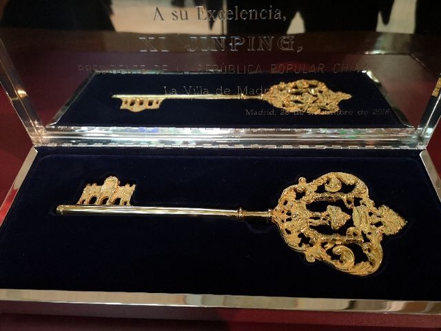 沒錯,這就是馬德里城市金鑰匙。鑰匙尾部是馬德里市徽上的“樹莓和熊”,齒部是馬德里地標(biāo)建筑阿爾卡拉門。11月28日,馬德里市長卡梅納代表馬德里全體市民把它贈送給習(xí)主席,表達(dá)對遠(yuǎn)道而來的中國貴賓的尊重和敬意。