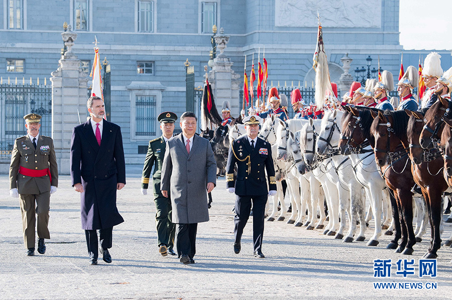 當(dāng)?shù)貢r間11月28日,國家主席習(xí)近平在馬德里出席西班牙國王費(fèi)利佩六世舉行的隆重、盛大的歡迎儀式。這是習(xí)近平在費(fèi)利佩六世國王陪同下檢閱騎兵方隊。(新華社記者李學(xué)仁攝)