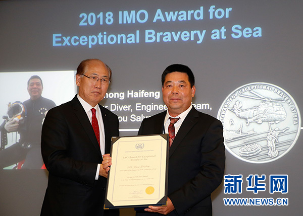 新華社倫敦12月7日電(記者梁希之)中國(guó)廣州打撈局高級(jí)潛水員鐘海鋒6日晚在倫敦獲得國(guó)際海事組織頒發(fā)的2018年度最高獎(jiǎng)項(xiàng)——“海上特別勇敢獎(jiǎng)”。