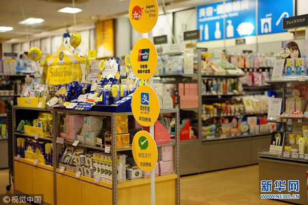 7月14日,日本大阪的某商場,幾乎每一個專柜前都立有中國移動支付的提示牌。(圖片來源:視覺中國)