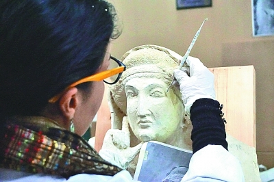 12月5日,在敘利亞首都大馬士革,文物修復(fù)師赫芭·朱馬在國(guó)家博物館內(nèi)修復(fù)來自巴爾米拉的受損雕像。新華社發(fā)