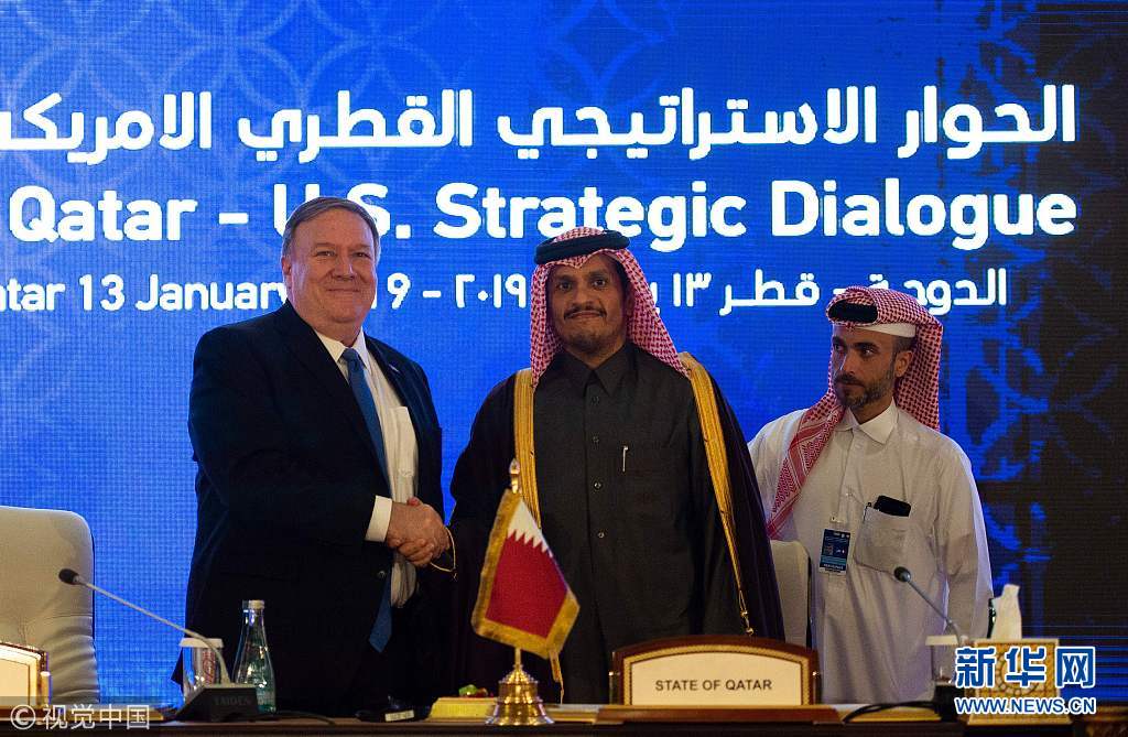 2019年1月13日,卡塔爾多哈,美國國務卿邁克·蓬佩奧訪問卡塔爾。蓬佩奧與卡塔爾副首相兼外交大臣穆罕默德在多哈的喜來登大酒店簽署了諒解備忘錄和意向聲明并舉行聯(lián)合記者會。蓬佩奧表示,兩國外交部門領導人當天簽署了一份諒解備忘錄,將擴建和改造烏代德美國空軍基地。(圖片來源:視覺中國)