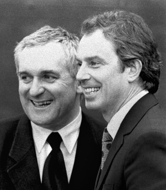當時,代表愛爾蘭和英國政府簽署協(xié)議的分別是時年47歲的愛爾蘭總理伯蒂·埃亨和45歲的英國首相托尼·布萊爾。