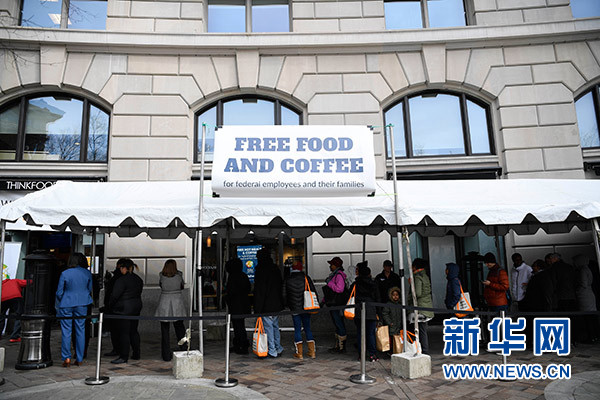 1月23日,在美國(guó)首都華盛頓,一些聯(lián)邦政府雇員在一家公益組織的“應(yīng)急食堂”外排隊(duì)領(lǐng)取免費(fèi)餐。 新華社記者 劉杰 攝